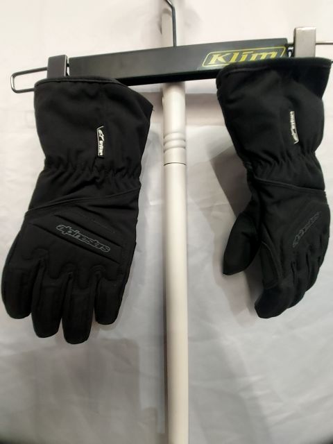 Short gauntlet style. Drystar waterproof lining. Padded knuckles and palm. Textile top / leather palmside. Women's sizing. Slight wear