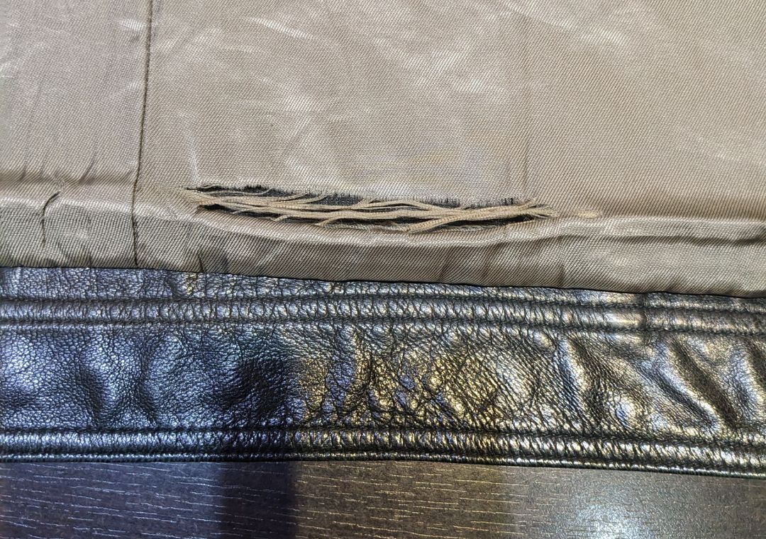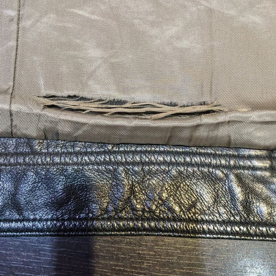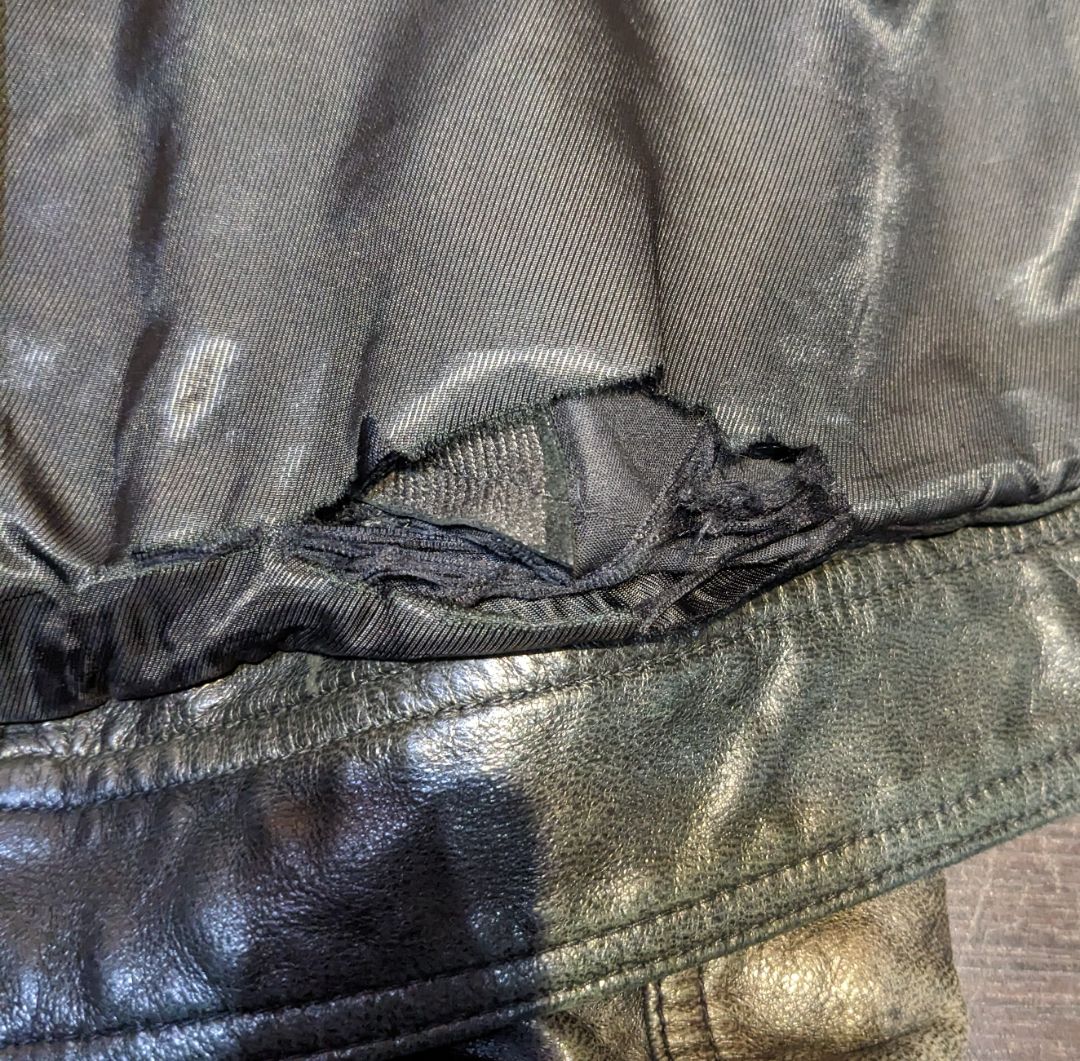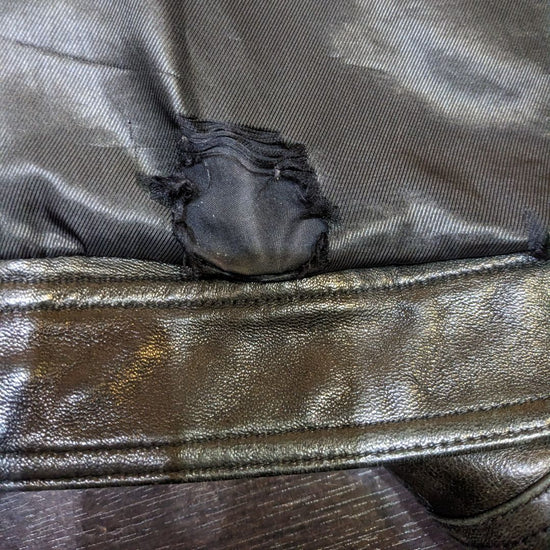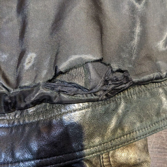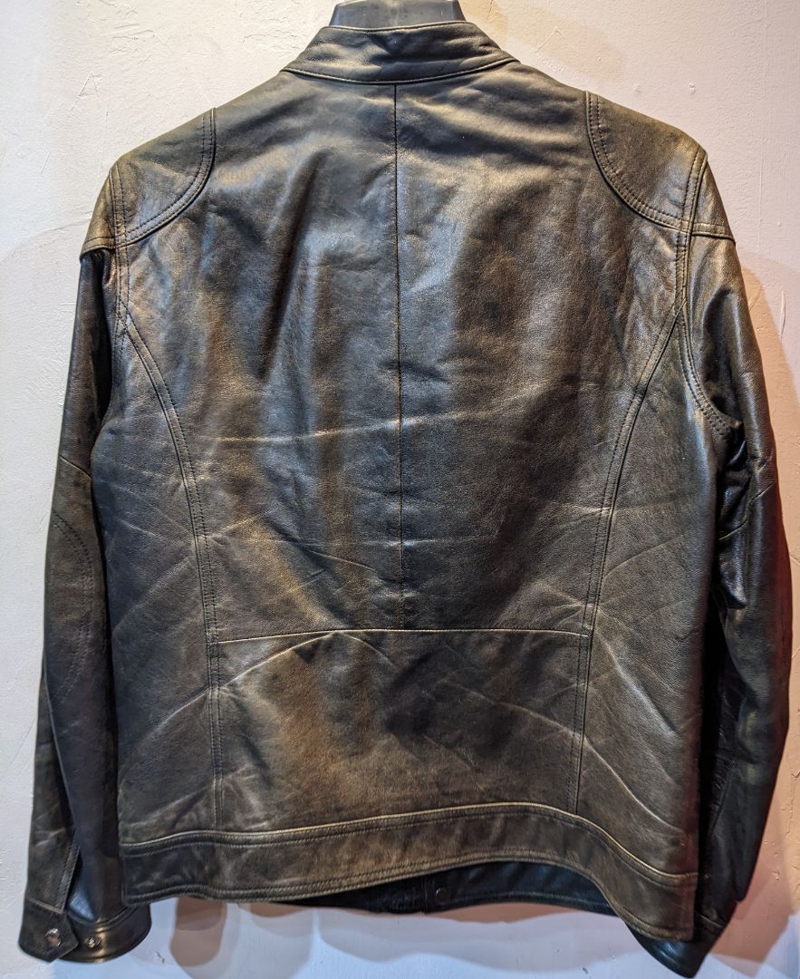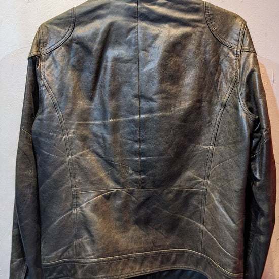 Fashion cafe racer in soft lambskin. Zip close with snap storm flap. Buckled collar. Some wear / patina. FLAW: tears in lining. Chest 42". Men's sizing. MSRP $650