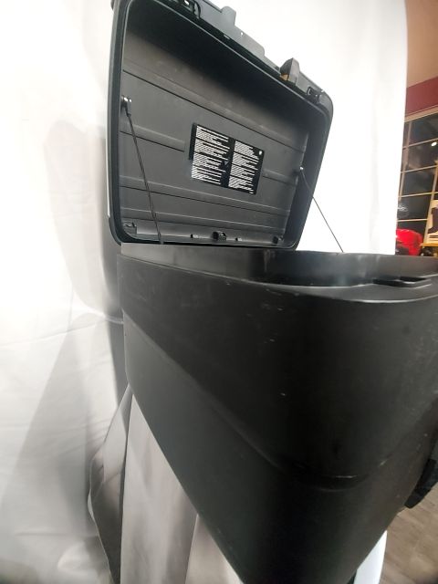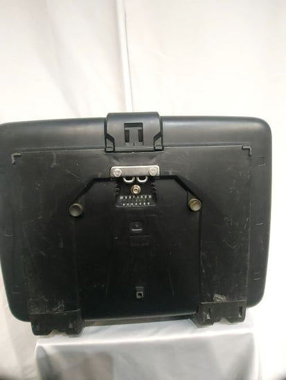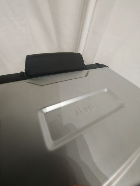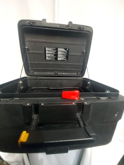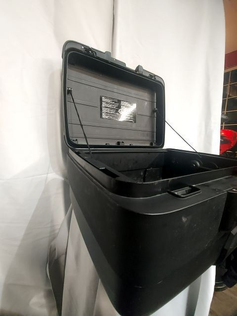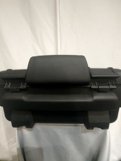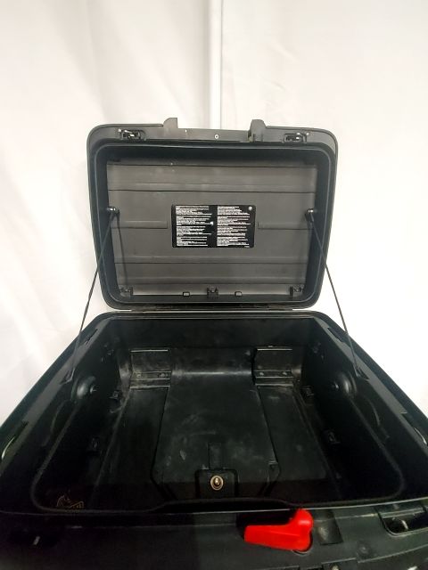 Top box. 1 Key. Has lever to raise and lower to make box bigger or smaller. Has padded rest for passenger back. THIS ITEM WILL INCUR AN EXTRA SHIPPING CHARGE BECAUSE OF WEIGHT.