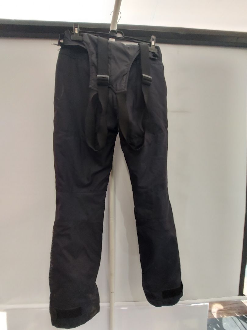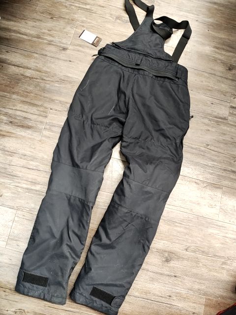 Knee and hip armor. Detatchable suspenders. Waterproof lining. Reflective elements. Men's sizing. Slight wear