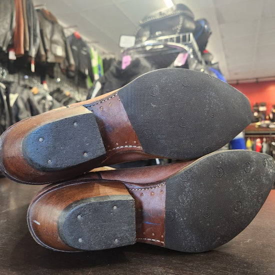 FLAW: Soles detaching at heels. Otherwise structurally sound. Leather lined. Topy sole