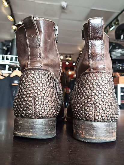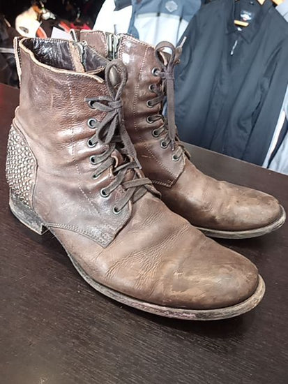 Made in Italy. Inside zip. Welted leather sole. Some wear and scuffing