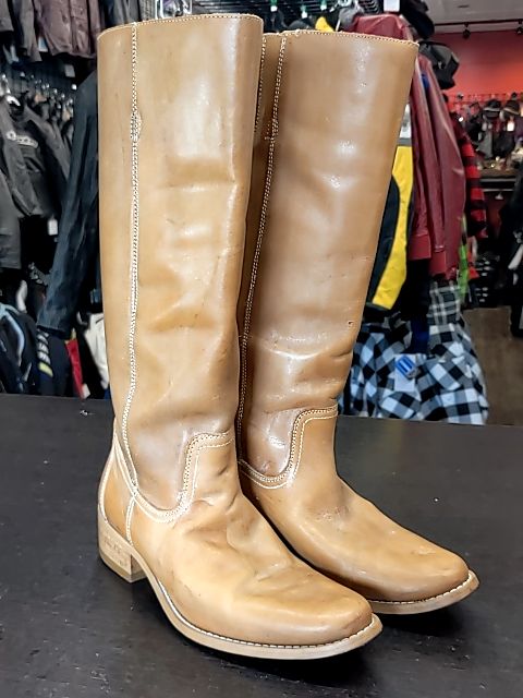 Leather lined. Welted leather sole. Elastic panels at inside top of shaft. Hidden boot pulls. Virtually no wear, but dented on left toe