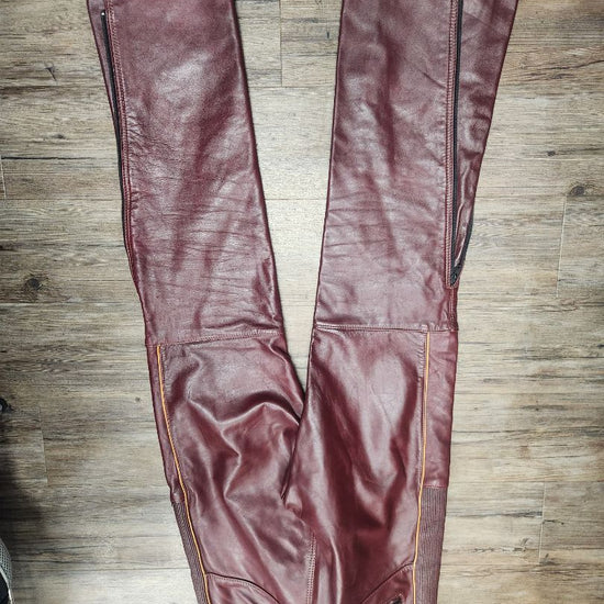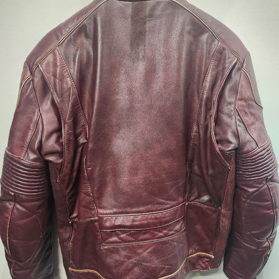 Vintage. Part of Drospo's "Taurus" line. Accordion panels at sides, elbows and hips. Light padding at elbows and shoulders. Slight overall wear, except at back of collar which is heavily worn