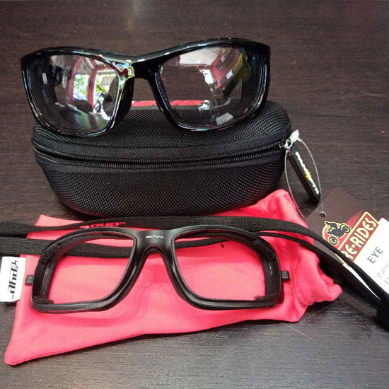 Sunglasses made for riding. Impact resistant. Comes with hard case, soft bag, extra gasket and strap. MSRP $166