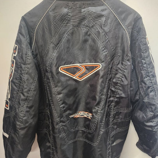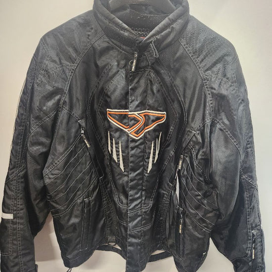 Older model. Winter sports jacket, would work as lighter riding jacket. Removable liner. Venting. Reflective elements. Drawstring at bottom hem. Men's sizing. Slight wear