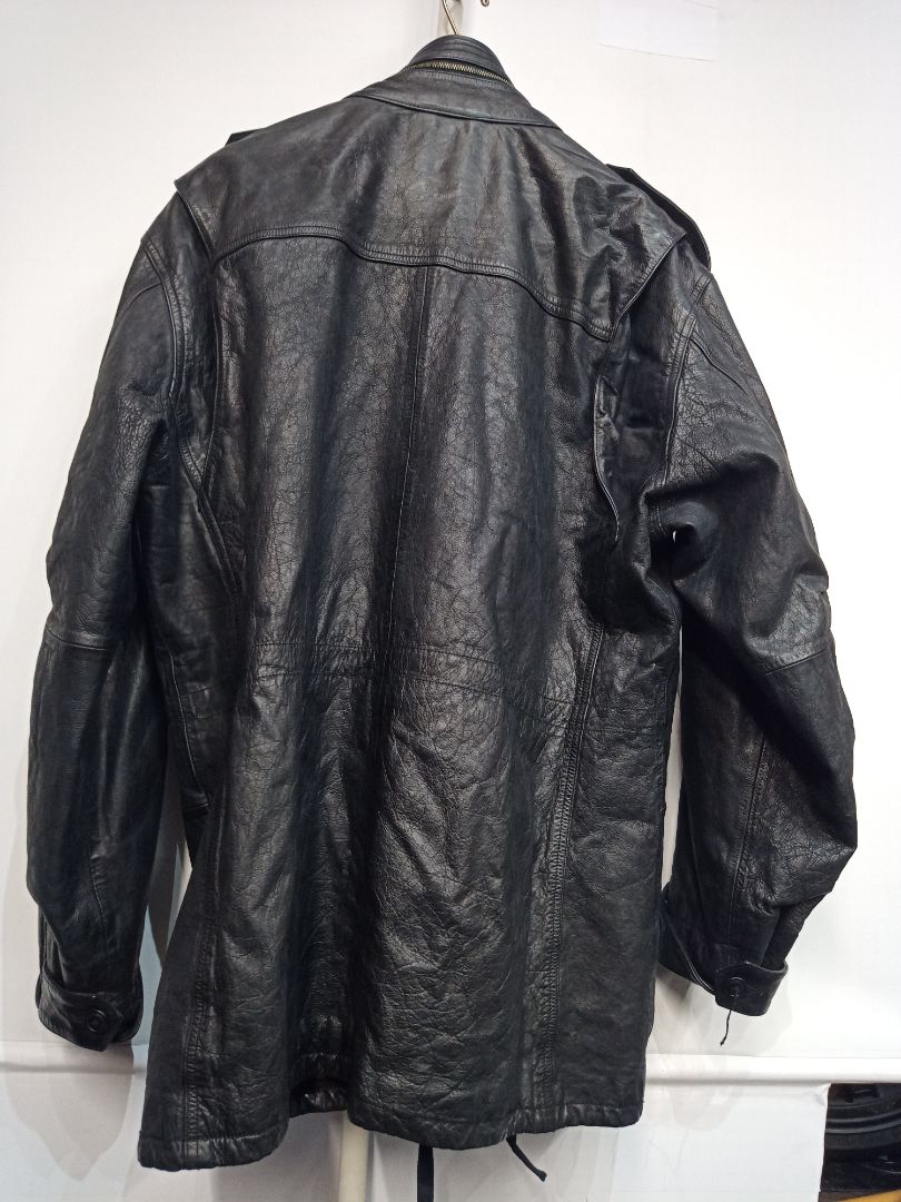 Vintage. Lots of pockets. Nice supple leather. Mix between a trench/car coat/cargo coat. VERY cool. Slight flaw: Missing a button at the collar that can be easily replaced. Men's fit.