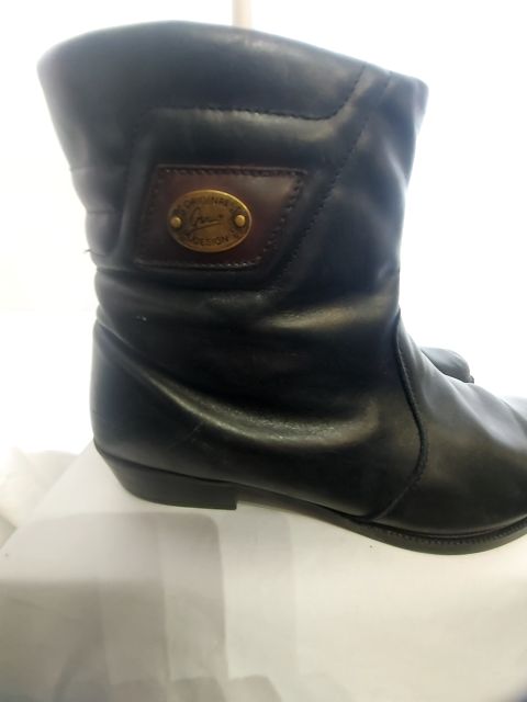 Vintage Genico slouch ankle boot. Inside zips. Fleece inside lining. Decorative stitching. Brass emblem. Super cool design. Mild wear on outside & pilling of the leece inside.