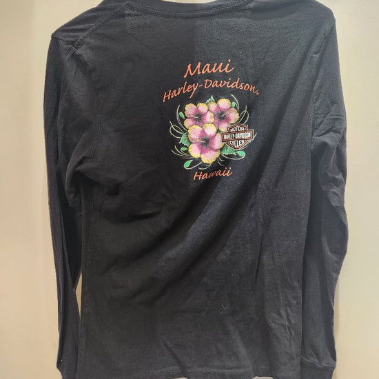 Floral design on front. Maui, Hawaii dealership design on back. Women's sizing. Slight wear