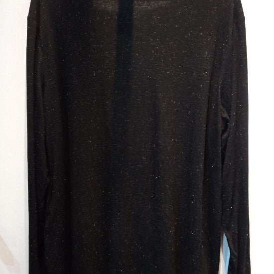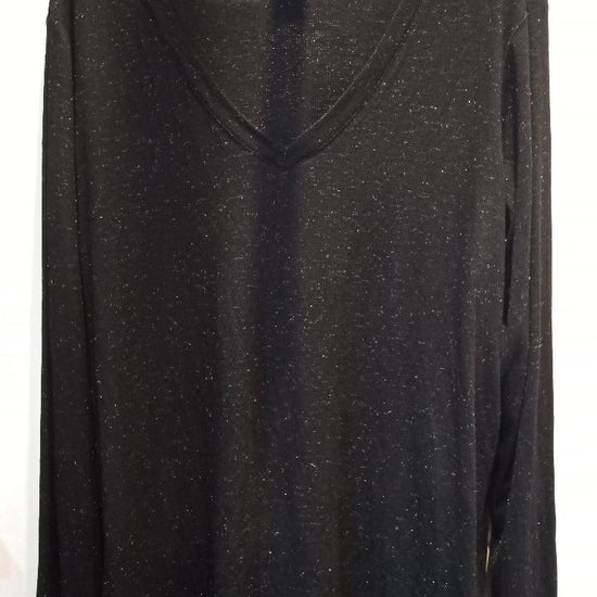 Very stretchy fabric. Sparkles/shimmers when light hits it. Extra-long sleeves. Low v-neck. Woman's sizing.