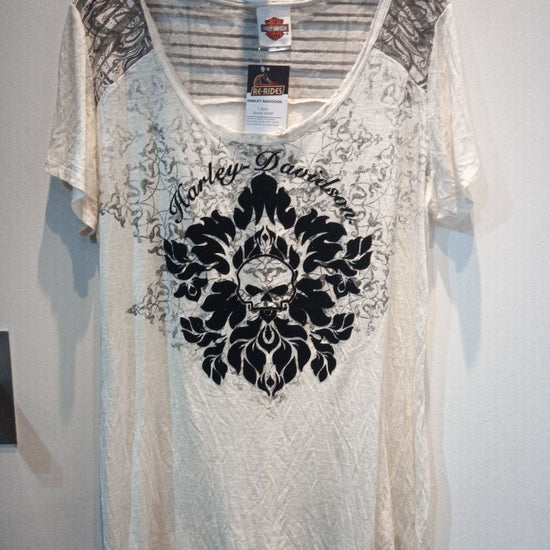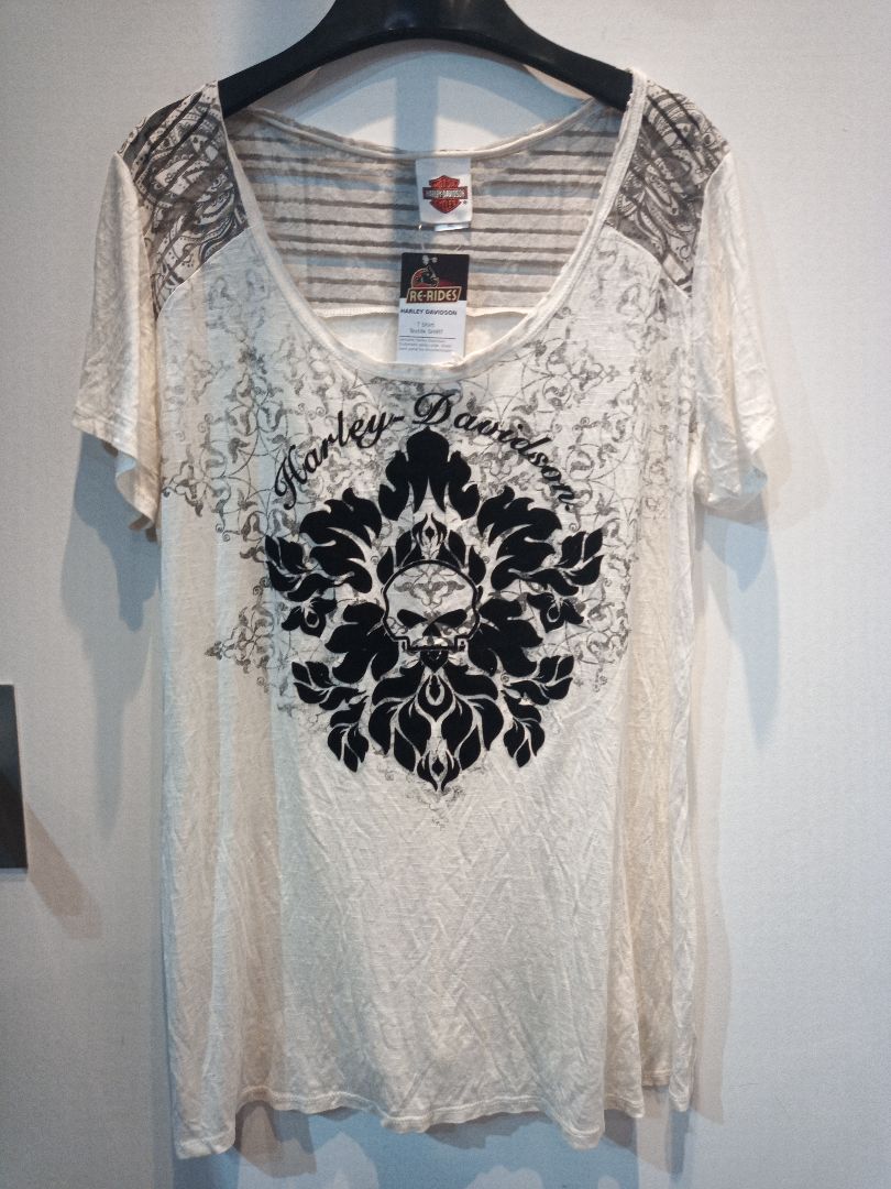 Genuine Harley Davidson. Distressed deep collar. Sheer back panel by shoulderblades. Woman's sizing.