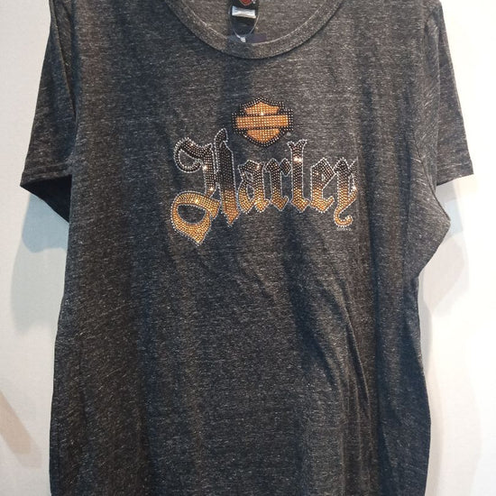 Genuine Harley Davidson. Writing and emblem on the front shimmers in the light. Woman's sizing.