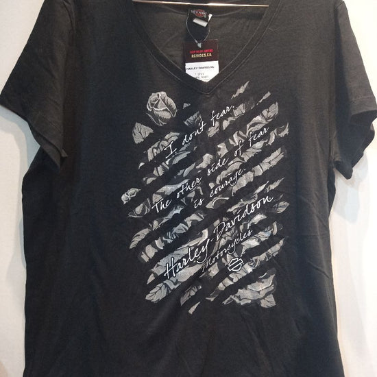 Genuine Harley Davidson. V-neck. Roses and script pictured. Woman's sizing.
