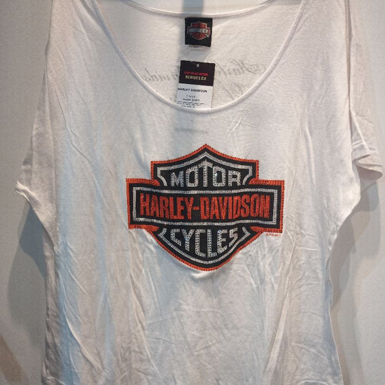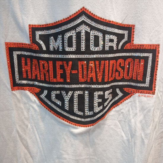 Genuine Harley Davidson. Very deep neckline. Rhinestones all over emblem in front. Woman's sizing.