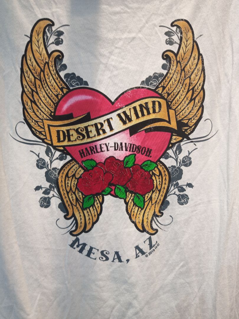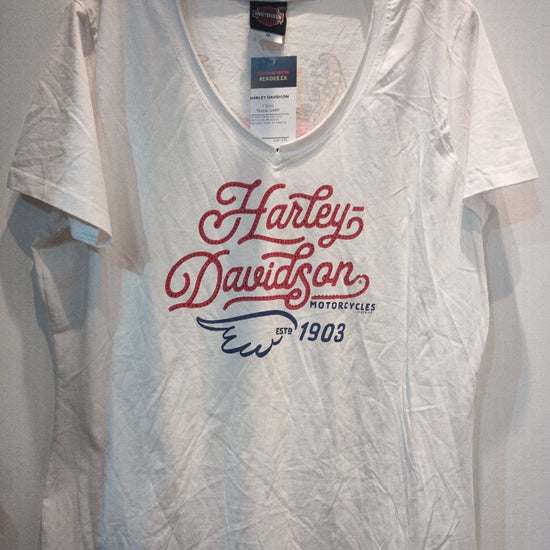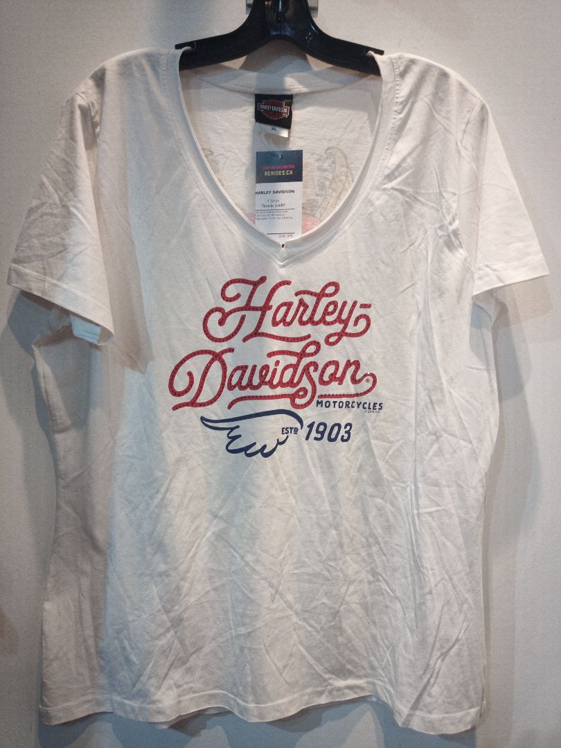 Genuine Harley Davidson. 1903 script. Rhinestore highlights in the red lettering. Woman's sizing.
