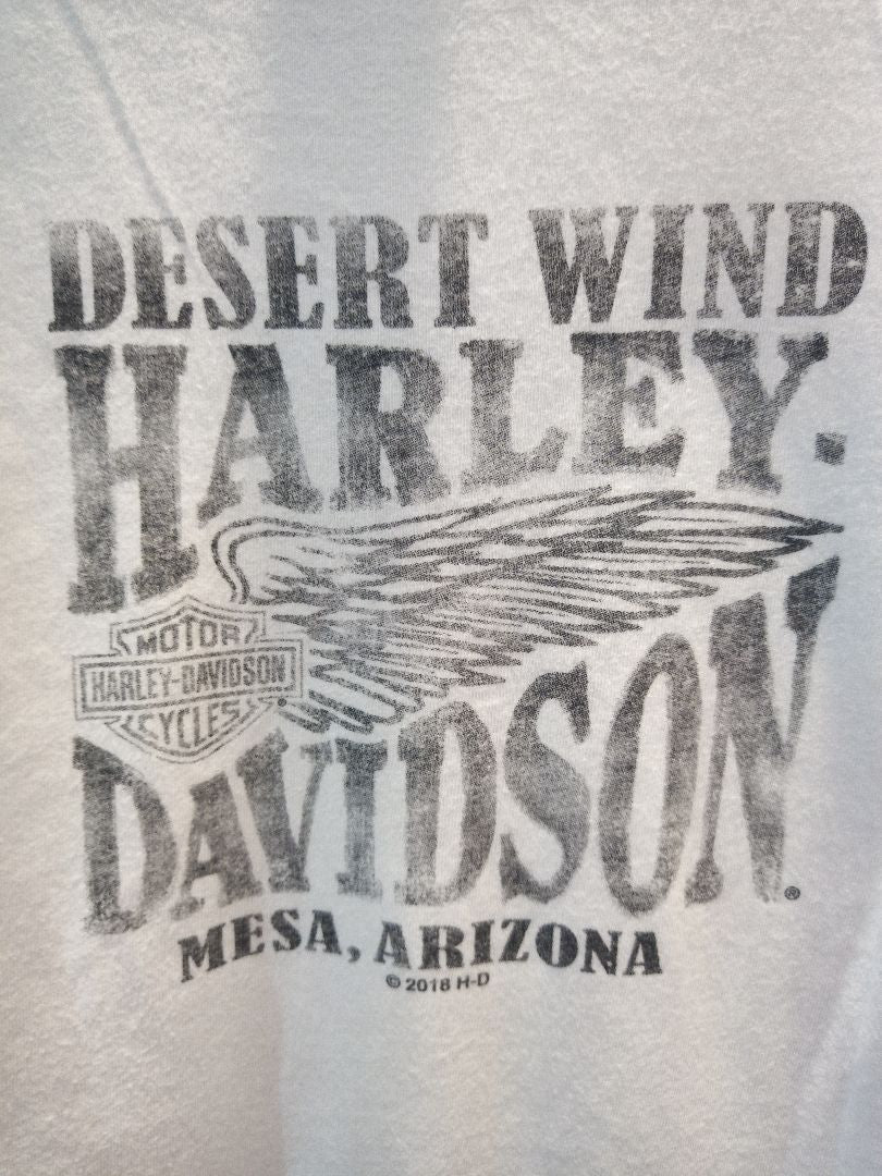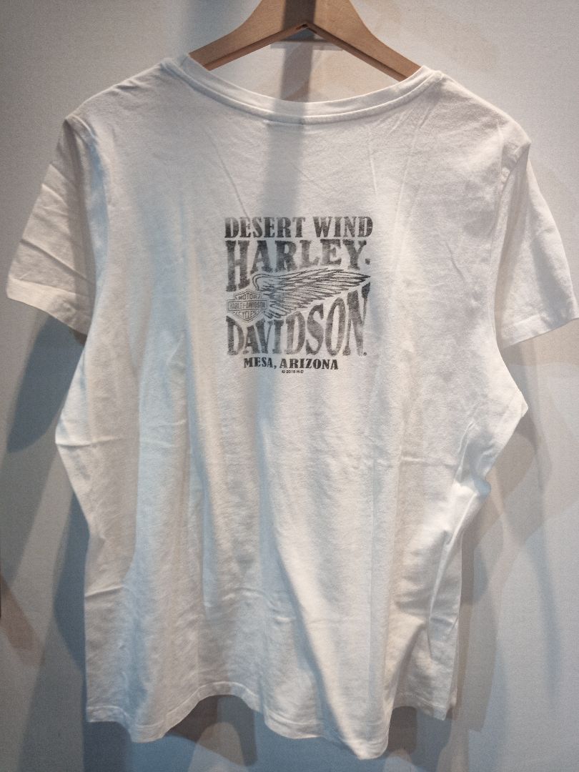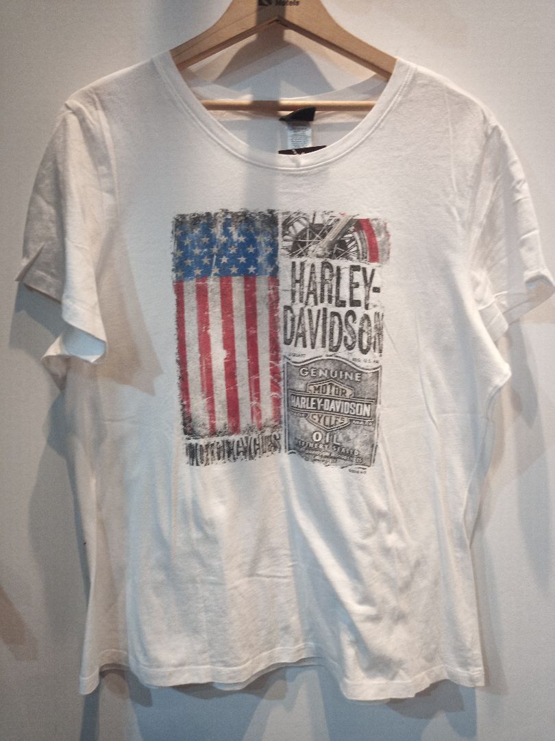 Genuine Harley Davidson. Wide neck. Small staining depicted in photos by collar and left arm. Woman's sizing.