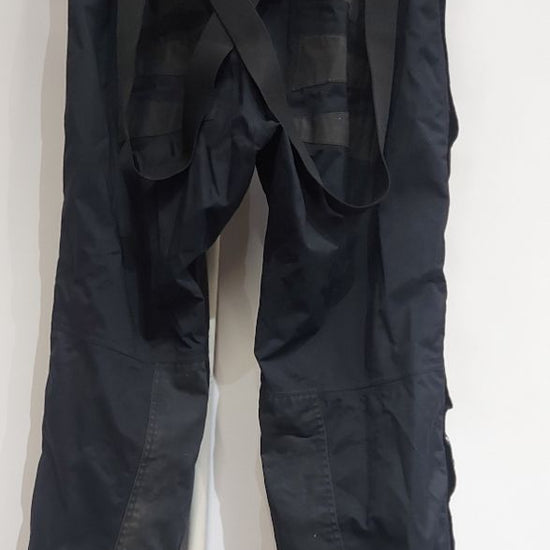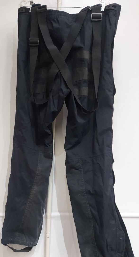 Foldaway hood in collar of jacket. Attatched suspenders and underfoot stirrups on pants. Reflective elements. Men's sizing. Some wear