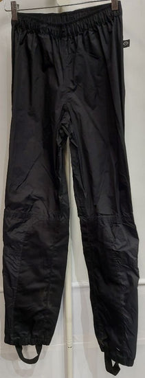 Hood folds into collar. Reflective elements. Under foot stirrups on pants. Very little wear