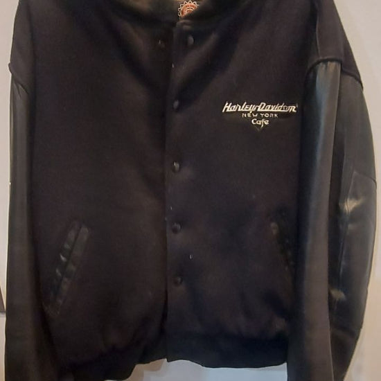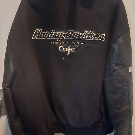 Wool and nylon blend body. Leather sleeves. Harley Davidson Cafe logo embroidered on front and back. Some wear and pilling. Men's sizing.