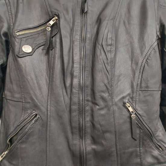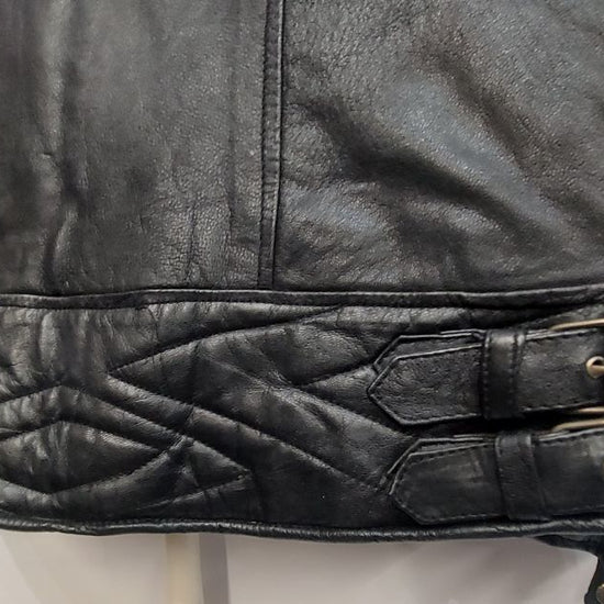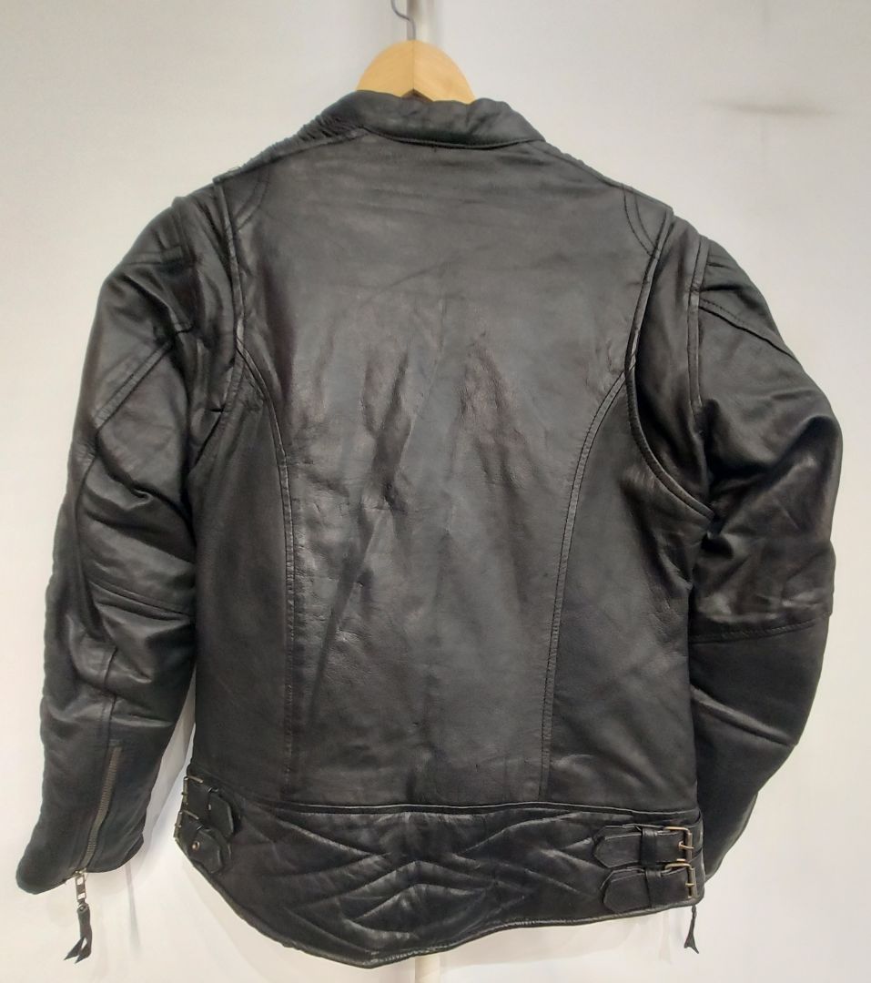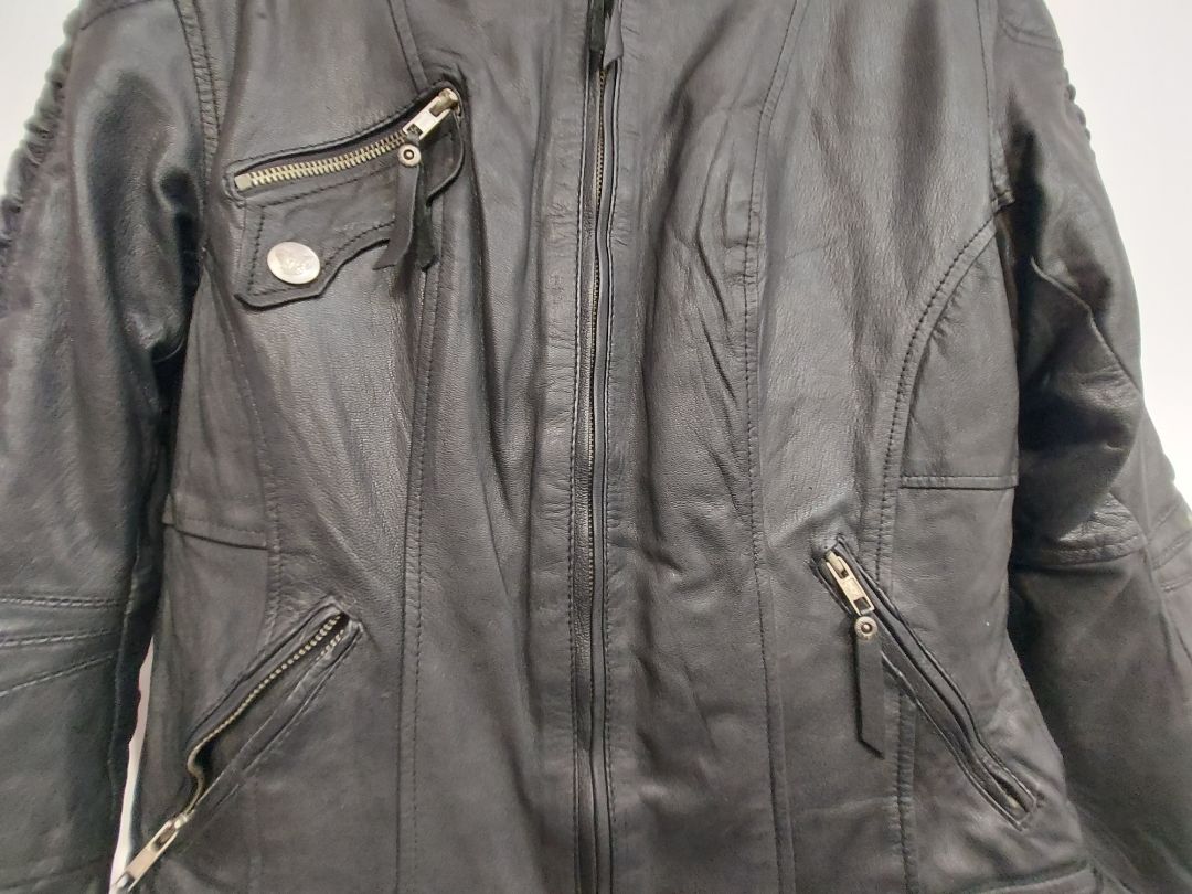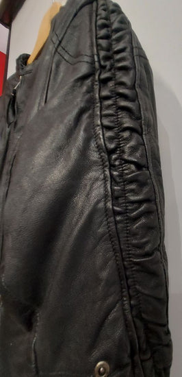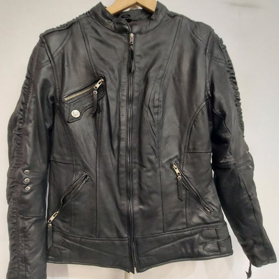 Midweight leather. Removable liner. Ruched details along sleeves. Women's sizing. Very slight wear