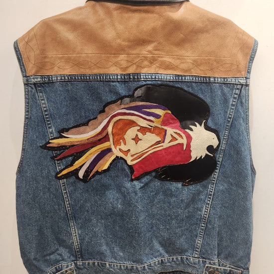 Zipper hidden behind buttons. Leather panels on shoulders and yoke. Handmade suede bird design on back