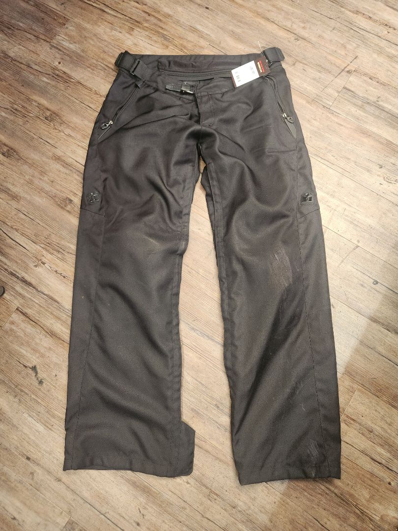 Overpant style. Knee armor. Zippers down insides of thighs. Men's sizing. Some wear