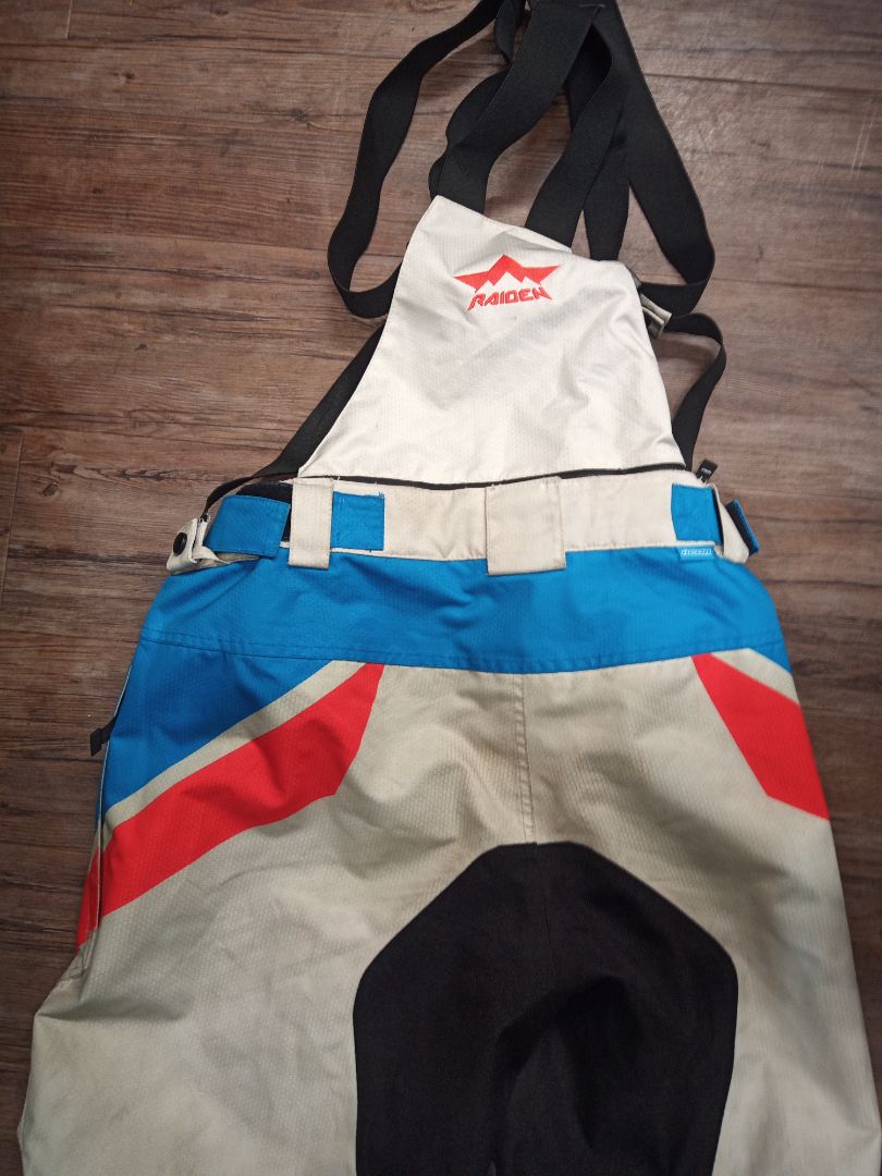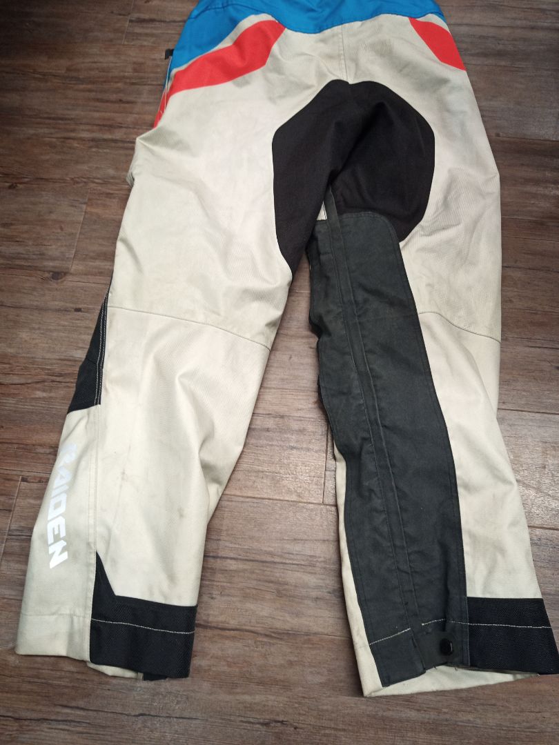 Knee and hip armored (D3O at hip). Waterproof. Zips open to inside top of thigh. Detachable DKR bib & suspenders. Inseam 32". Reflective elements. Some wear and staining. Men's sizing.