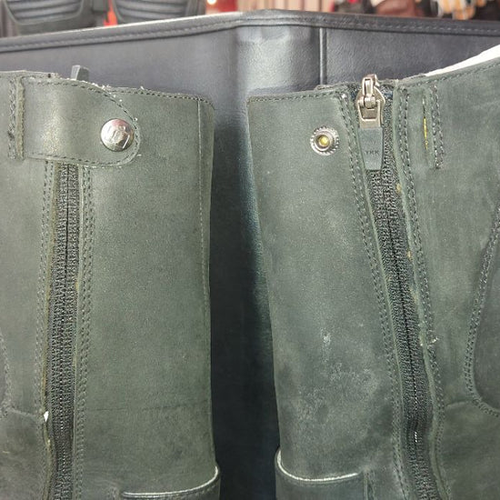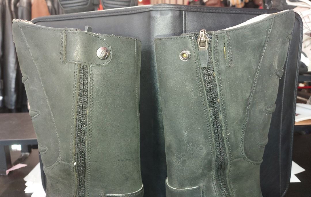 Heel and ankle & shin protection. Tall version. Inside zips & outside double straps. Small Flaw: Missing tiny flap on left boot. Doesn't hinder riding but refelected in price. Very little wear.