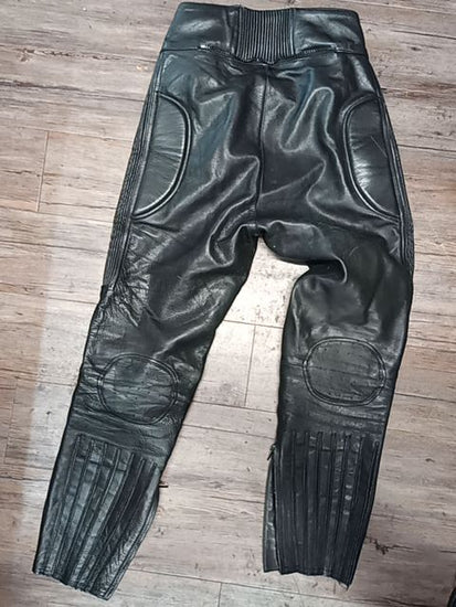 Vintage. Light padding at knees & hips. Accordion panels and hips, thighs and knees. Men's sizing. Slight wear. FLAW: Small tear at bottom of fly
