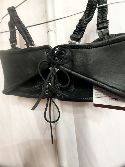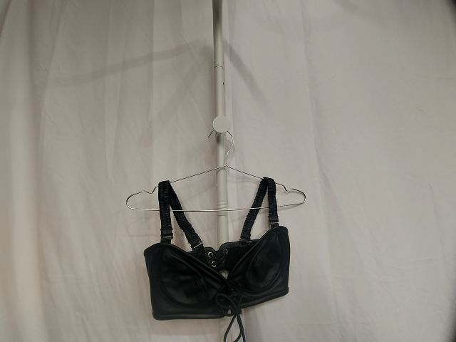 Locally handmade in Vancouver BC. 2 eyelet djustable leather lacing on back. Leather stretch straps for shoulders. Beautiful detailing. Unlined. Not for water. Stamped 36B.