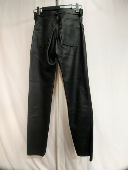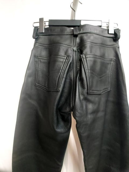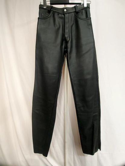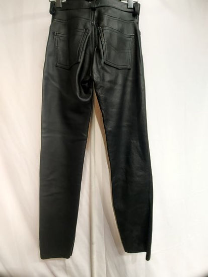 New. Locally handmade in Vancouver BC. Unlined. Beautiful medium thick soft supple leather. Single panel. 6 snap fly. 5-pocket style. Inseam 32". Beautifully made. Men's fit.