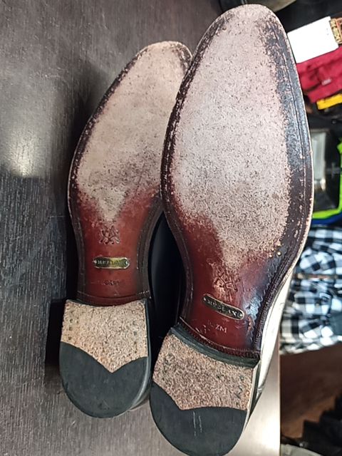 Hi shine finish. Leather sole. MSRP $475. Very little wear