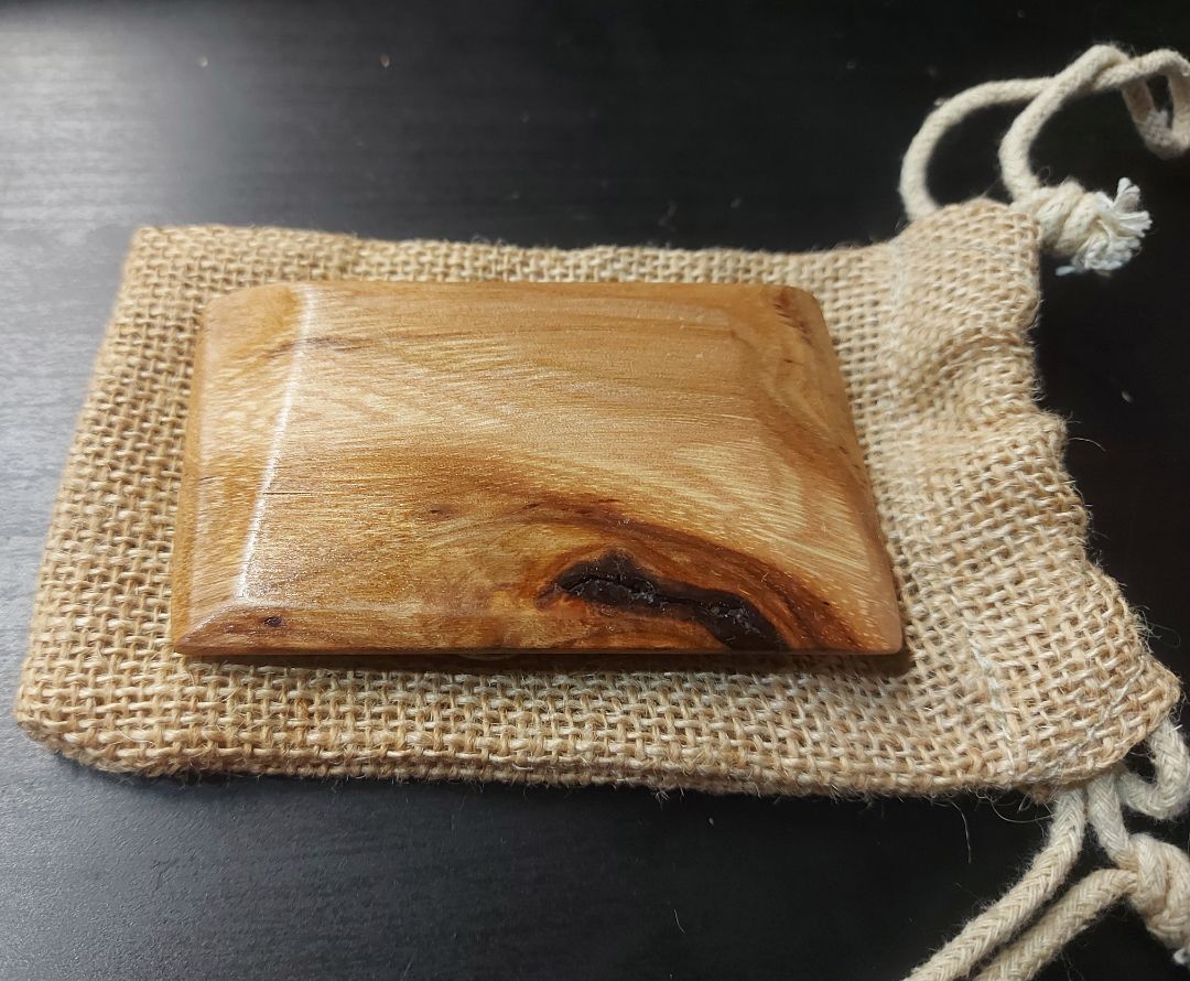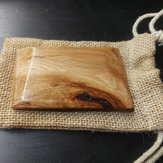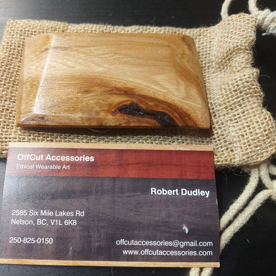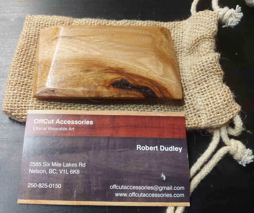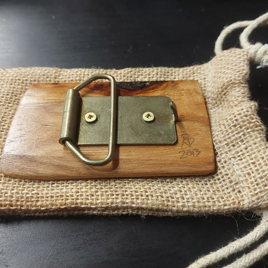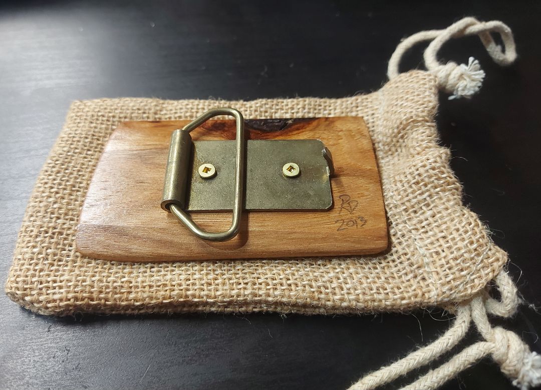 Hickory wooden buckle with clear coating. Made in Nelson BC by artist Robert Dudley. Very little wear. Beauty of a piece!