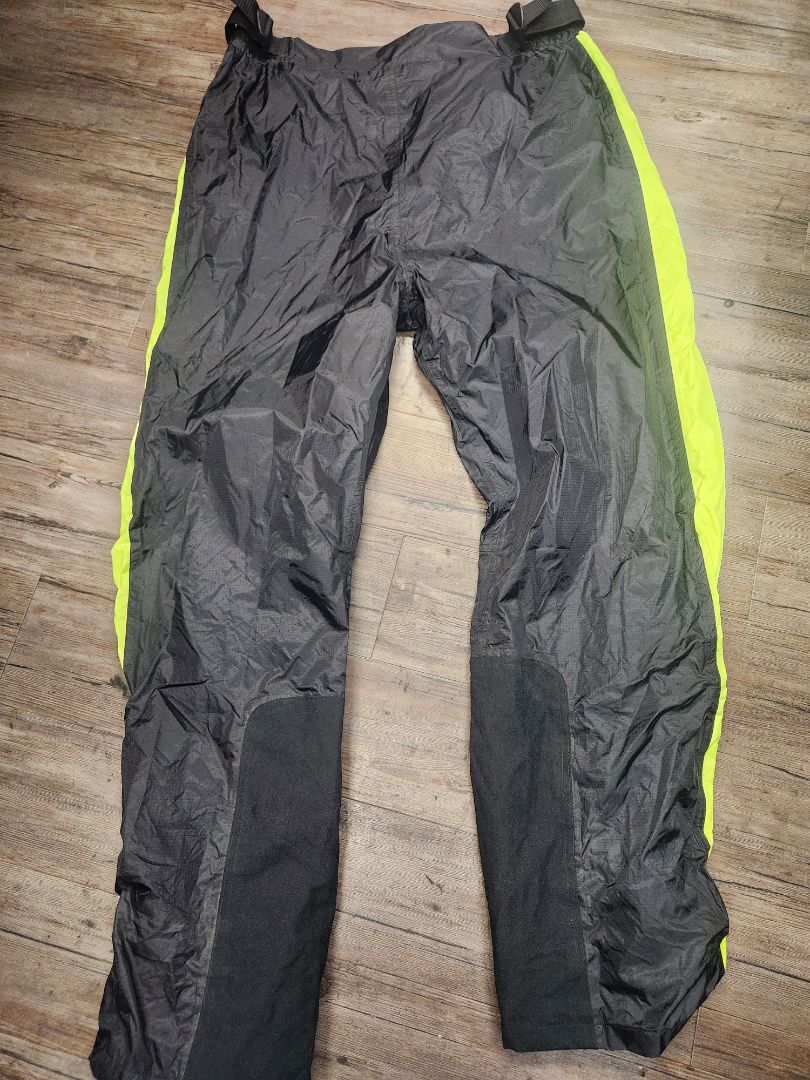 Older model. Reflective elements. Foldaway hood on jacket. Both peices fold into storage pockets. Men's sizing. Very little wear