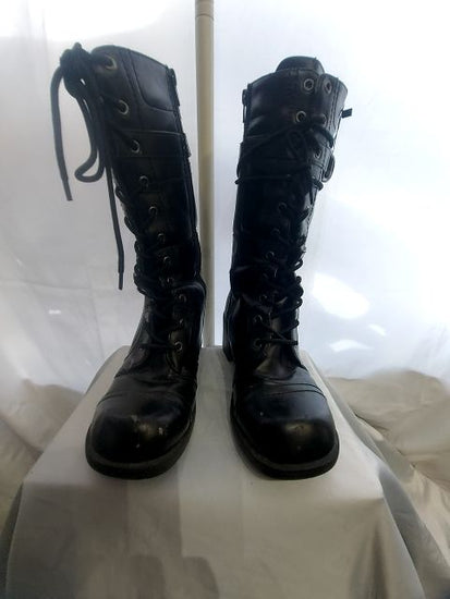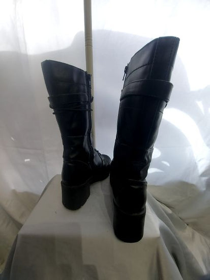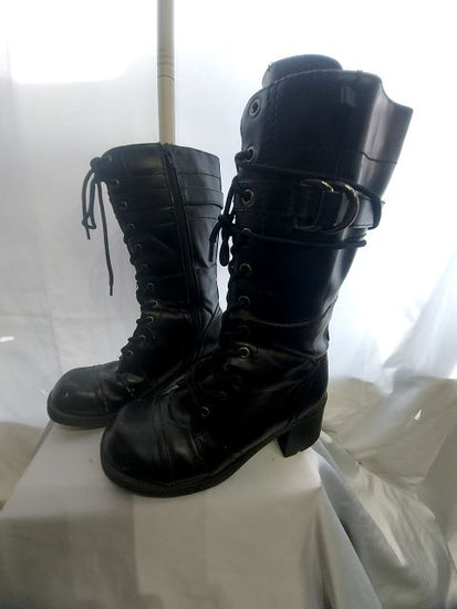 Super cute 11" cap toe (11 eyelet lacing) & inside zips or ease. Wedge heel 2.5" at tallest point/ 1.5" at lowest. Decorative d-ring buckles & stitching. Shineable. Wear & scufs all over.
