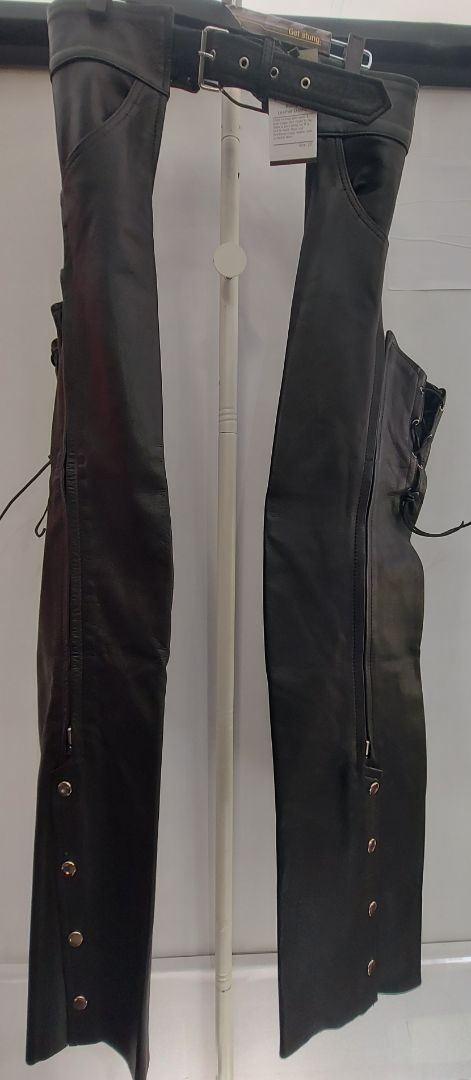 Lined to knee with mesh. 4 boot snape then zipper to hip. Sides & back lacing for fit & belt at waist. Basic and functional chaps. Appear new or barely worn.