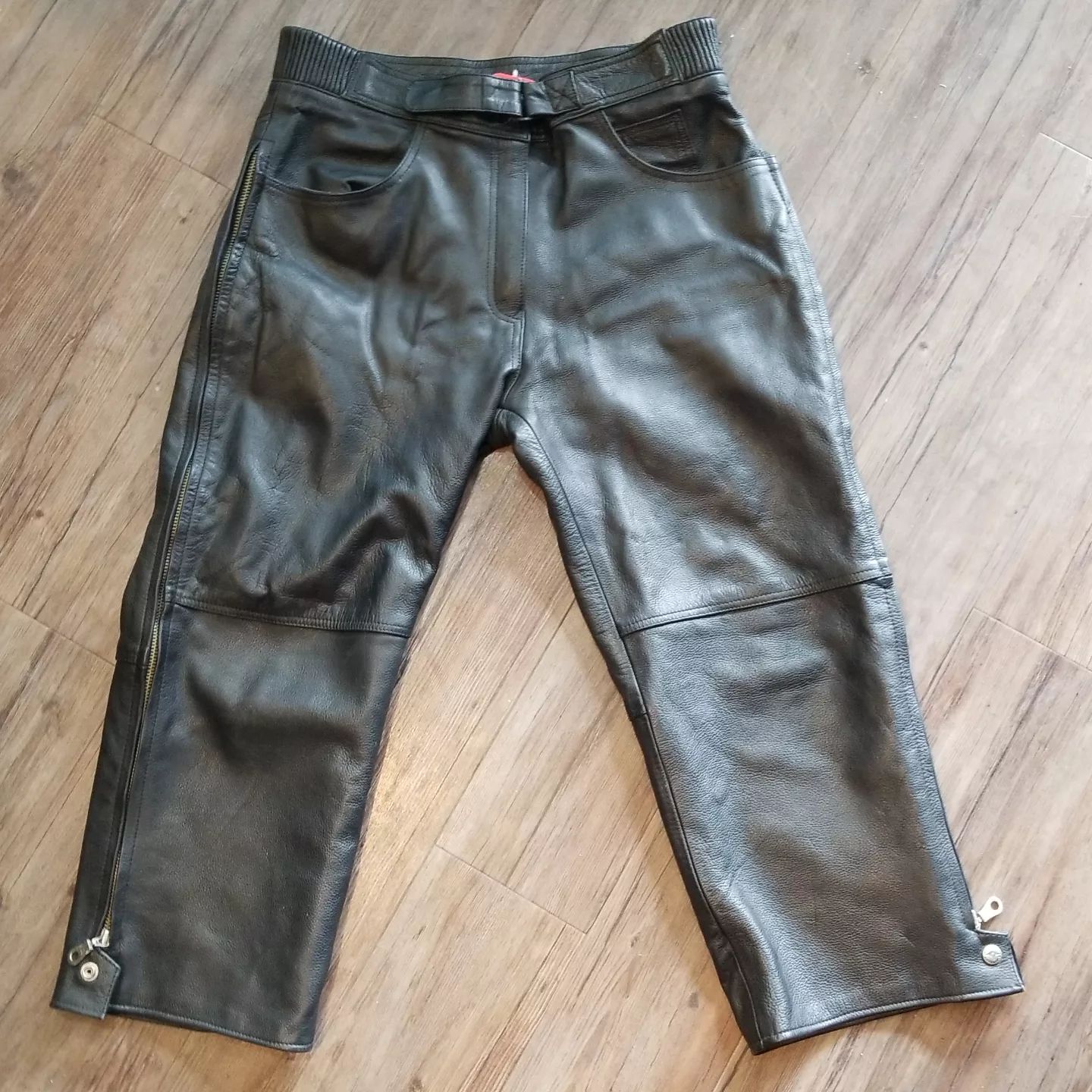 Very heavy leather! Lined. 5-pocket jean style. Velco & expansion panels for snug fit at the waist. Full leg side zips. 50" seat