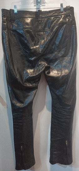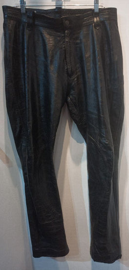 Jean style cut, but without pockets. Fully lined. Midweight leather. Men's sizing. Lining starting to tear at cuffs and seat.