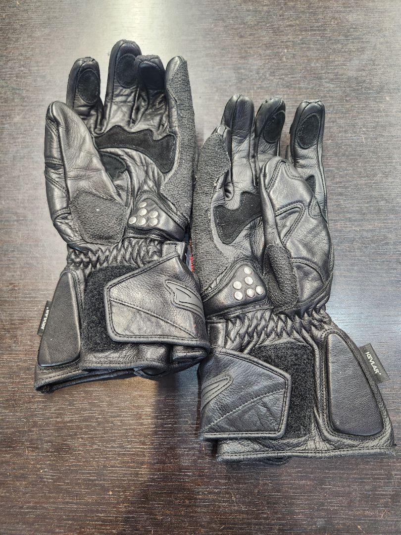 Padding at knuckle and cuff. Kevlar reinforcement and slider studs on palm. Very little wear