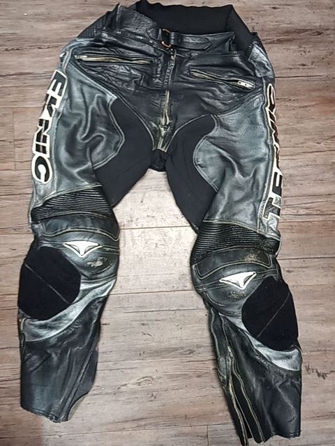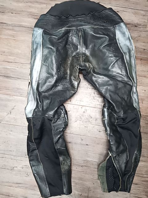 Knee and hip armor. Puckable. Reflective elements. Men's sizing. Overall wear and scuffing, especially to waist elastic