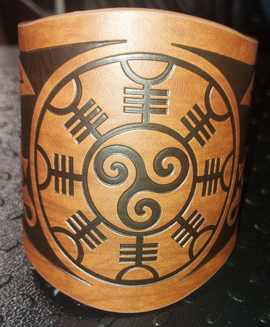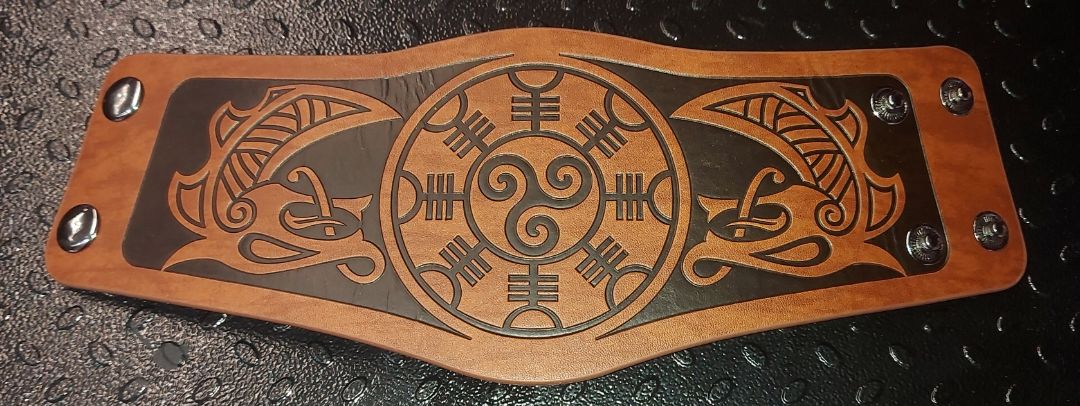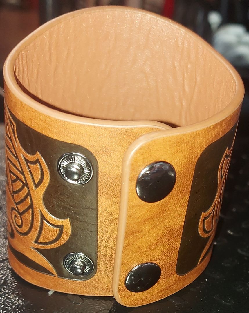 Embossed bracelet with snaps and 2 size settings. Medieval design. Great for everyday use, LARPing, renaissance fairs and more.