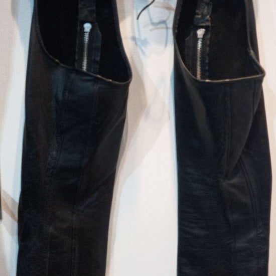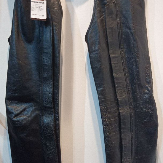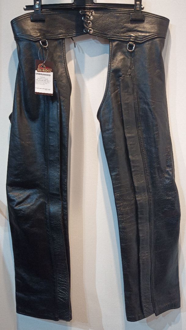 Unlined. Modified with inner leg panel to be slightly larger. Roller buckle. Very sleek leather. Slight wear