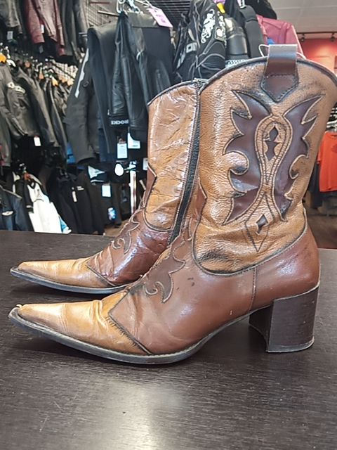 Heeled shortie western-style boots. Side zips. Quite worn / peeling.