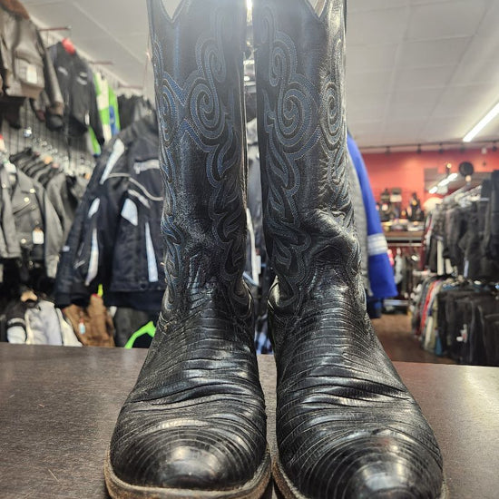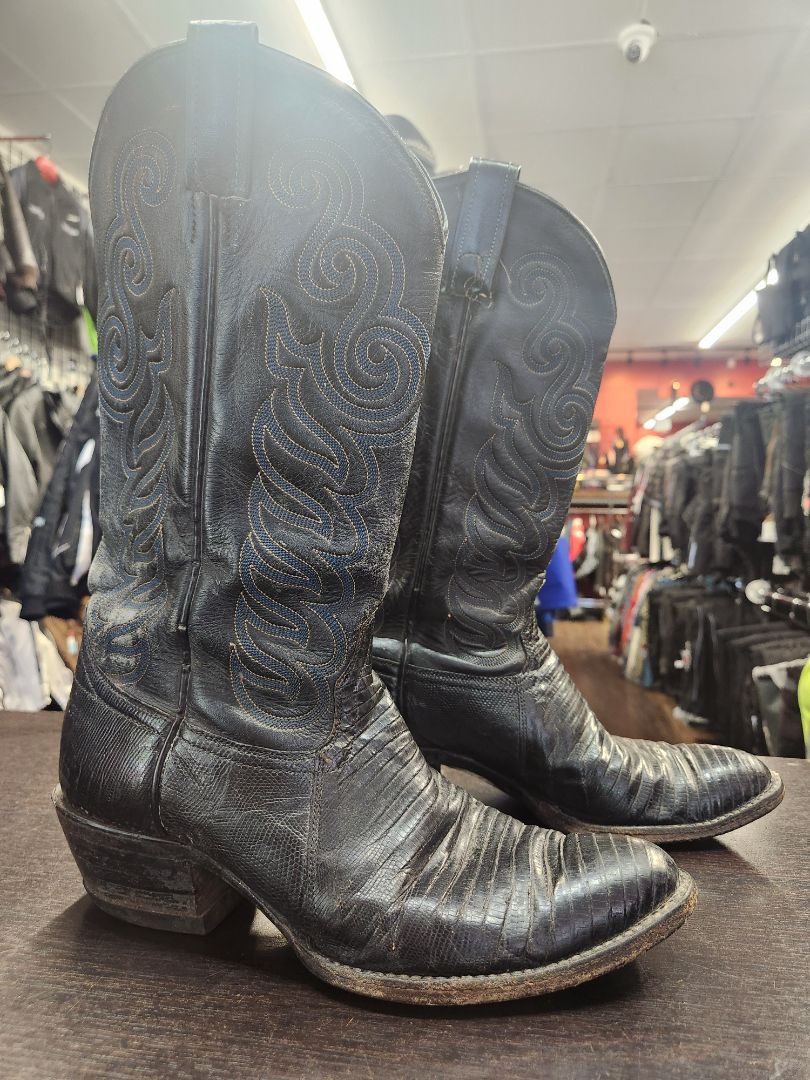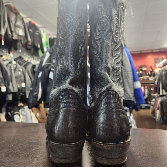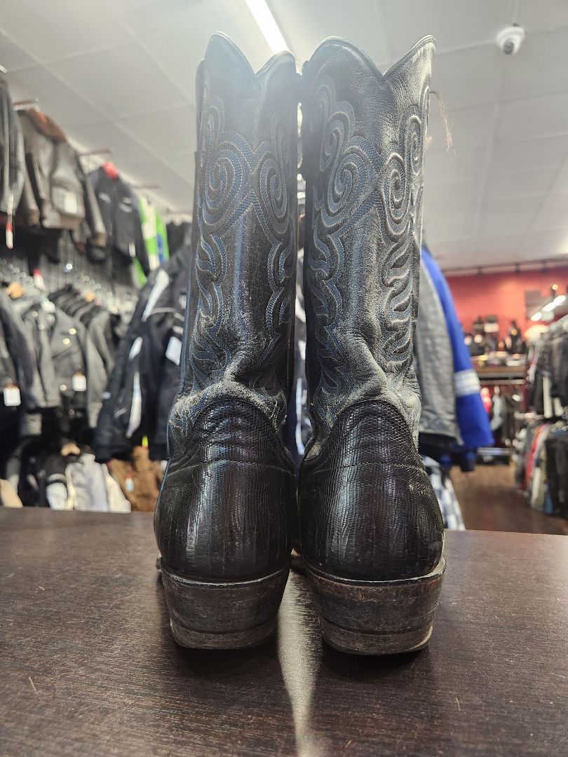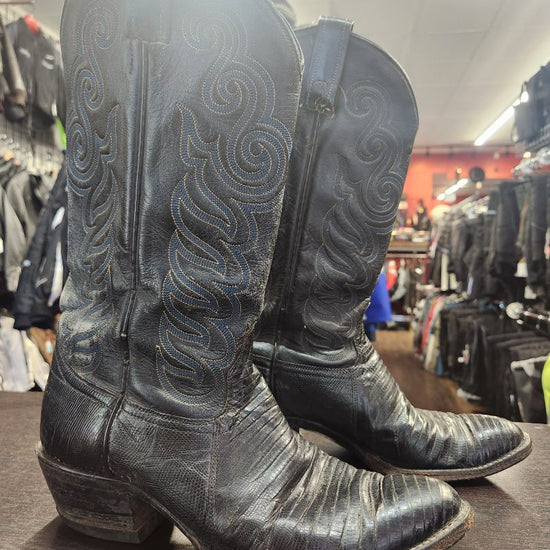 Blue embroidery. Heel wear / significant general wear. One detached boot pull. Faux lizardskin. Leather lined. Welted leather sole