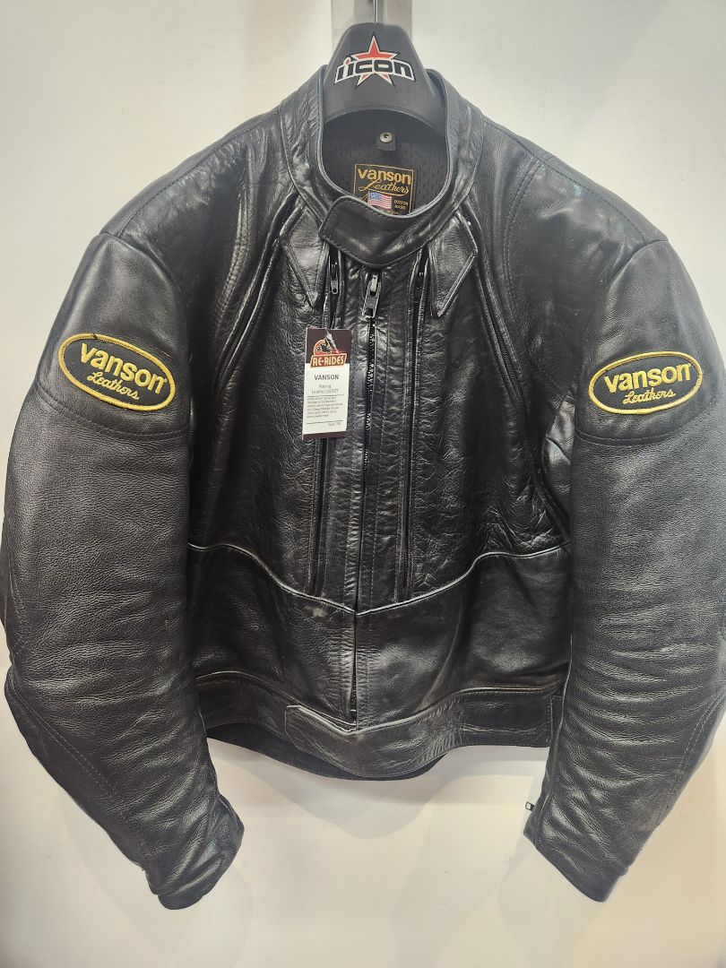 Elbow armor. Spine and shoulder armorable with Vanson velcro style armor(not incl.) Deep triangle shaped chest vents. Men's sizing. Tagged Vanson size 54 Some overall wear