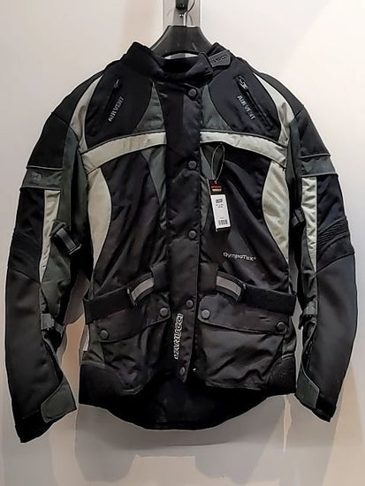 Older model. Touring style. All armor. Two removable liners, one warm and one waterproof. Venting. Reflective elements. Men's sizing. Very little wear