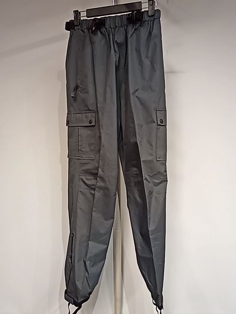 Hidden drawstring at waist of jacket. Under foot stirrups on pants. Men's sizing. Very little wear