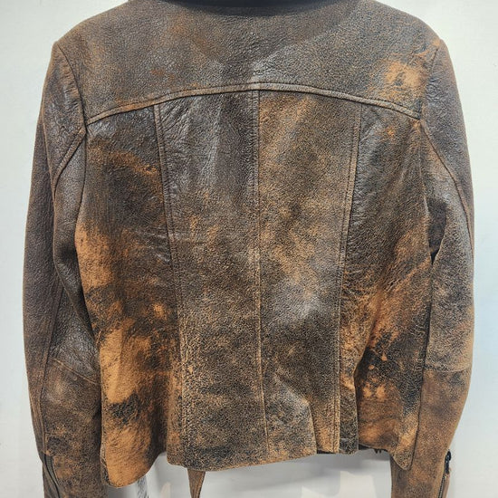 Factory distressed finish. Lightweight leather, not suitable for riding. Men's sizing. Some wear
